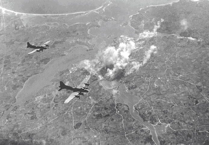 Document : photographie aérienne oblique prise le 6 mars 1943, lors du bombardement de Lorient . Les B-17 appartiennent au 305th Bomb Group