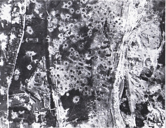 La photographie a été prise en juillet 1944. Le paysage lunaire parsemé de centaines de cratères de bombes est le résultat des 16 raids alliés menés contre cette base de lancement entre le mois de mars 1944 et juillet 1944.