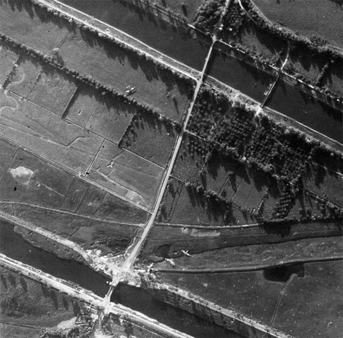 Cette photographie a été prise dans les heures qui suivirent la capture de ce pont par les troupes aéroportées britanniques. On distingue nettement les planeurs du Major Howard qui amenèrent à pied d’œuvre les hommes de la 6th Airborne Division