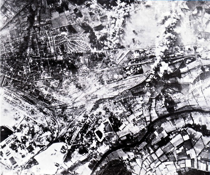 Cette photographie a été prise lors d’un bombardement à haute altitude de l’aérodrome du Mans par l’aviation alliée.