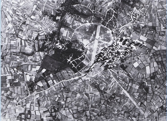 Ce document a été pris le 10 juin 1944 lors d’un bombardement par l’aviation alliée. On peut apercevoir les exposions au sol groupées sur la zone technique. Des cratères sont visibles à proximité de la piste d’atterrissage, trace de raids précédents.