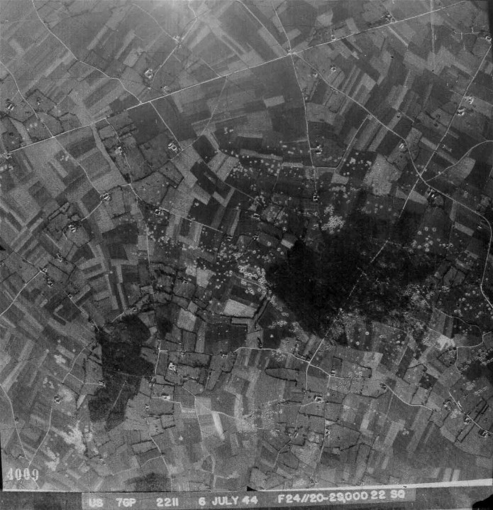 Cette photographie a été réalisée le 6 juillet 1944. La région est constellée de cratères de bombes.