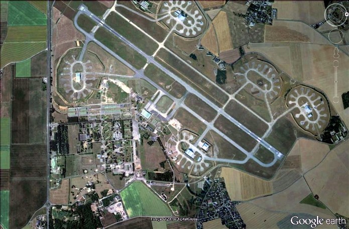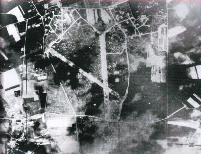Sur le cliché pris à la fin du conflit, on aperçoit de nombreux impacts de bombes, preuve que la base aérienne fut la cible de l’aviation alliée.