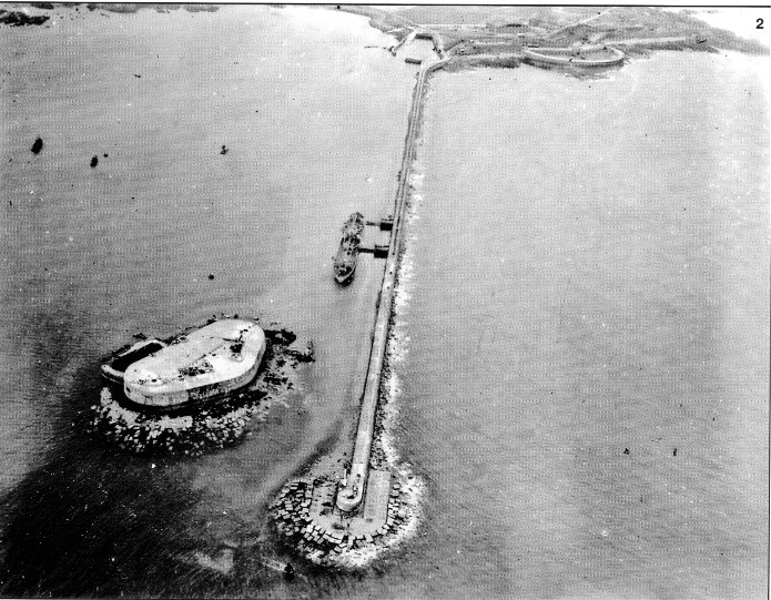 Sur la photographie, on aperçoit un pétrolier accosté au quai. Il décharge sa cargaison de précieux carburants qui acheminé par pipelines vers le front. Ce n’est que le 25 juillet, soit un mois après la prise de Cherbourg que le premier tanker allié ne vienne s’amarrer le long de la digue.