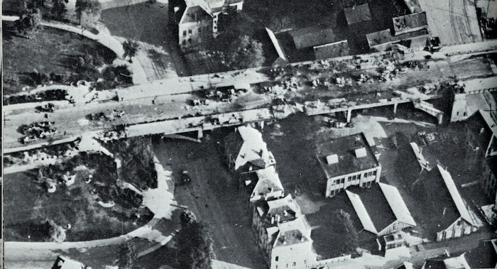 A une hauteur de 20 000 pieds, voilà à quoi ressemblait Arnhem vu du ciel le 19 septembre, au plus fort de la bataille. De la fumée s'échappe des maisons en feu près du pont et autour de l'hôpital Sainte-Élisabeth et du musée. Le pont ferroviaire démoli est visible. L'hôtel Hartenstein se trouve à droite de la piste de course ovale, tout en haut de la photo.