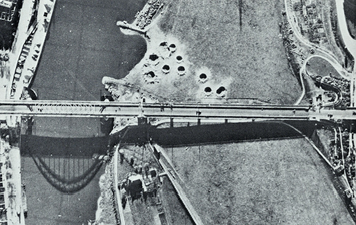 Cette photographie aérienne semi verticale prise par un avion de la RAF montre la rampe nord du pont routier d’Arnhem. On distingue les carcasses des véhicules détruits du capitaine Gräbner . Au moment de la prise de cette photographie, les parachutistes du bataillon Frost sont encore en position dans les bâtiments. Le lundi 18 septembre , vers 09h30, une colonne blindée , commandée par le SS-Hauptsturmführer Gräber comprenant 16 véhicules s’engage sur la rampe nord du pont . 14 véhicules seront détruits par les fusil mitrailleurs Bren, les armes antichars Piat et les mortiers légers. Gräbner, nouvellement récipiendaire de la Croix de Chevalier est tué dans l’action. Les équipages qui tenteront d’échapper à l’embuscade seront pratiquement tous tués. Les épaves calcinées resteront à l’entrée du pont.