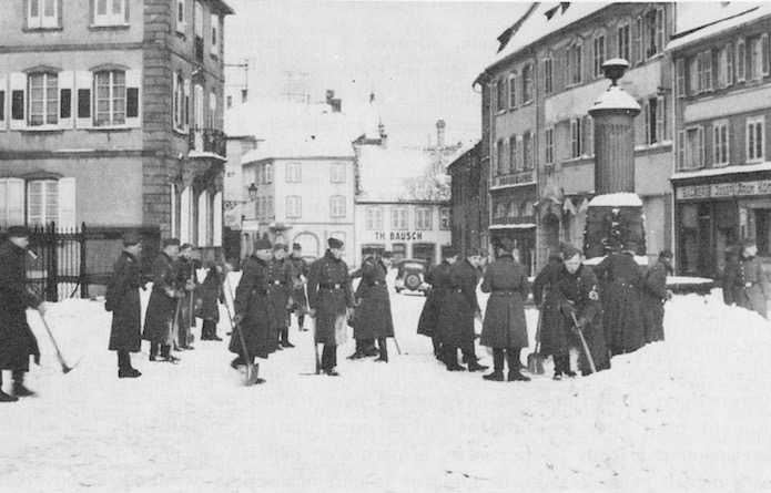 Des hommes du RAD déblayent la neige sur la place d’Armes (hiver 1940-1941)
