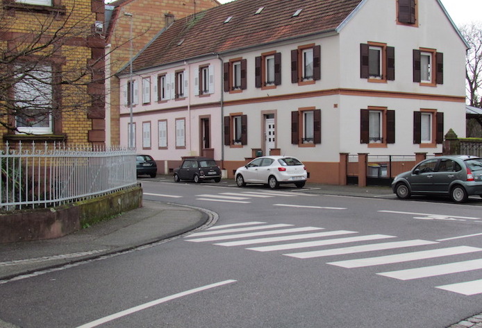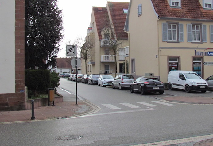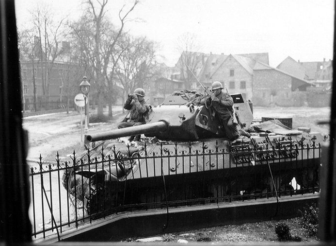 Un char Sherman, appartenant à la 14e DB US, progresse sur la route de Strasbourg à Haguenau. A l’entrée d’Haguenau, il effectue une halte devant le " Gasthaus Zum Fussball ". L’immeuble a souffert des combats. Les blindés soutiennent l’infanterie US qui déloge les derniers tireurs retranchés dans la ville.