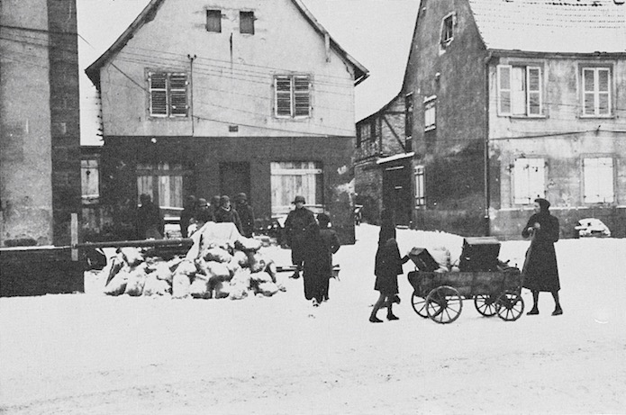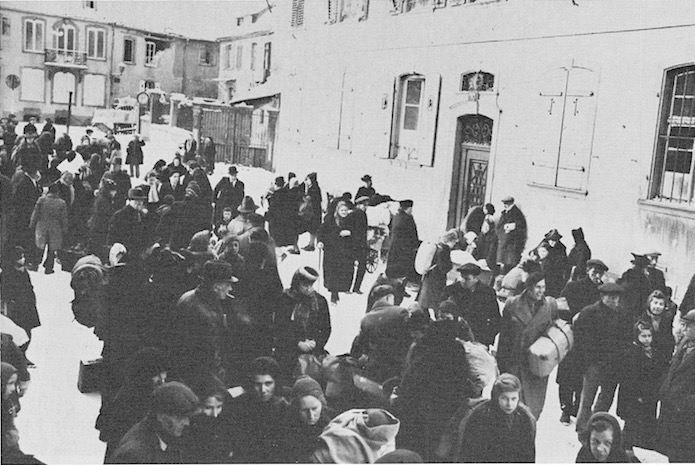 Préférant fuir la ville afin d’échapper à une nouvelle occupation allemande, des réfugiés se sont rassemblés près de la sous-préfecture en vue de leur départ.