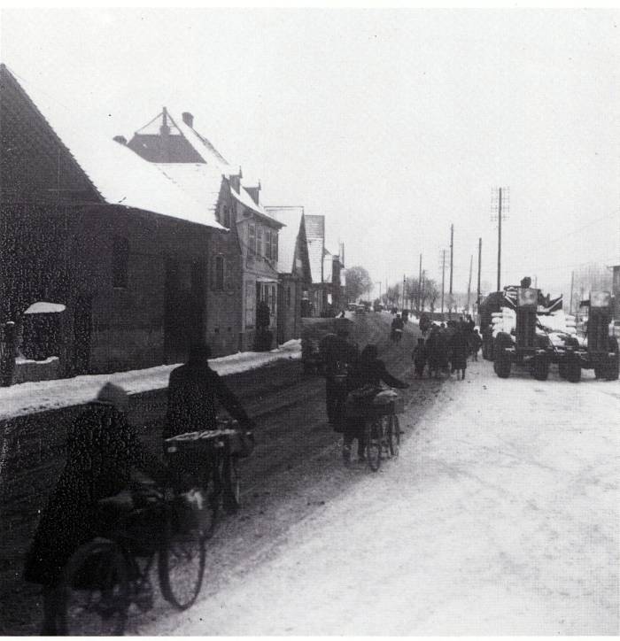 Des réfugiés longent la voie ferrée à la hauteur de Hochfelden. La neige et le froid sont présents et rendent encore plus pénible l’exode. On aperçoit à droite de la photo un tracteur M-26 Pacific et sa remorque porte-char M-15 stationnés à la hauteur du poste d’aiguillage. L’ensemble pourrait appartenir au 134th Armored Vehicle Maintenance Battalion