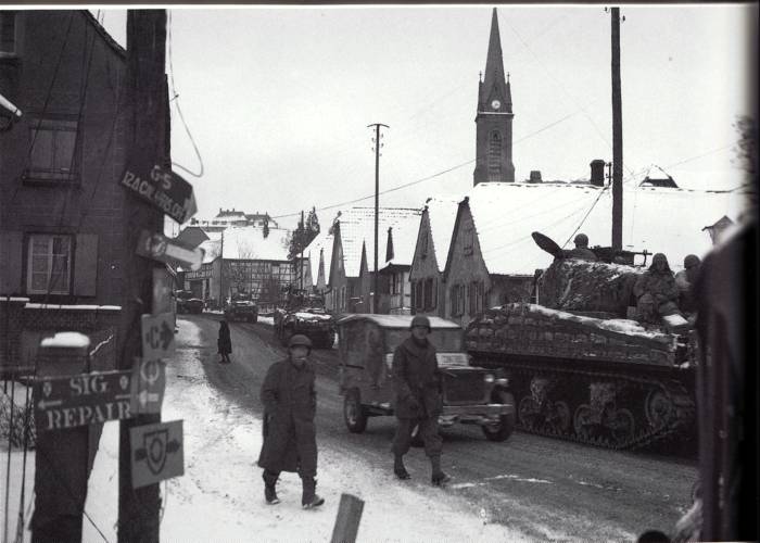 Des Sherman d’un Tank Battalion de la 12th Armoured Divison traversent Hochfelden. La neige et la pente de la rue principale ralentissent la progression de la colonne blindée. Le blindage du Sherman a été renforcé par des sacs de sable emprisonnés dans une superstructure soudé sur les flancs du char. Cette pratique était couramment répandue dans l’armée US. Ce blindage additionnel de fortune était peu efficace face à un obus de 88mm mais arrêtait une charge creuse provenant d’un Panzerfaust. Au premier plan, un poteau téléphonique sert de support à de nombreuses pancartes de signalisation. Sur l’une d’eux, on aperçoit distinctement un 12 et un triangle symbole tactique de la 12th Armoured Divison.