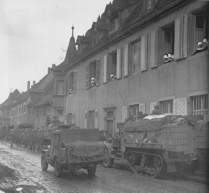Le 5 février 1945, rue Raymond Poincarré, des religieuses regardent passerles véhicules de la 12TH Armored Division. Sous les fenêtres stationne un halftrack du 119 Engineer Bn.