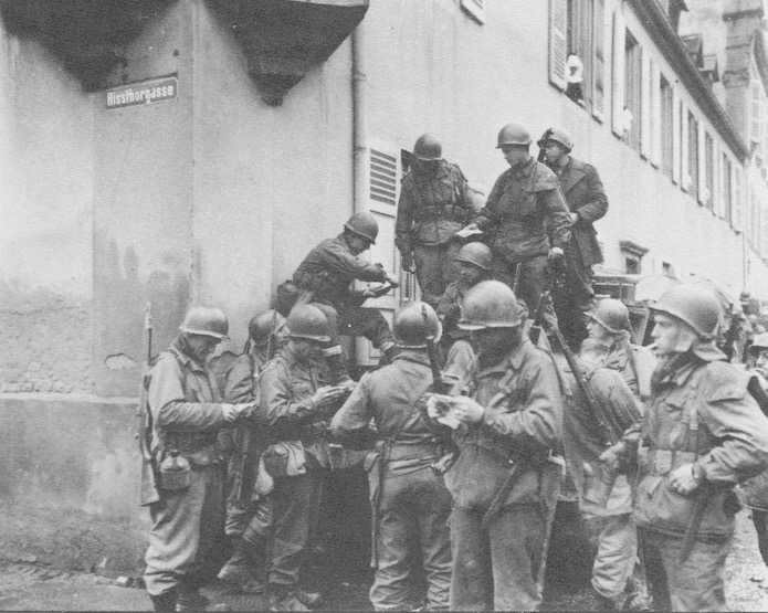 A l’angle des rues Poincarré et Riss (Ris Horgasse) un groupe de GI s’est rassemblé pour de la distribution du courrier.