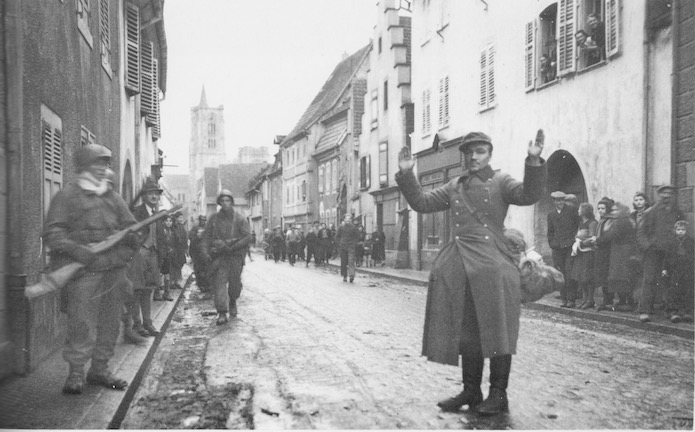 Rue Joffre, un prisonnier allemand désarmé mais qui a conservé son paquetage en vue de sa captivité pose pour le photographe. L’infanterie américaine progresse de part et d’autre de la rue.
