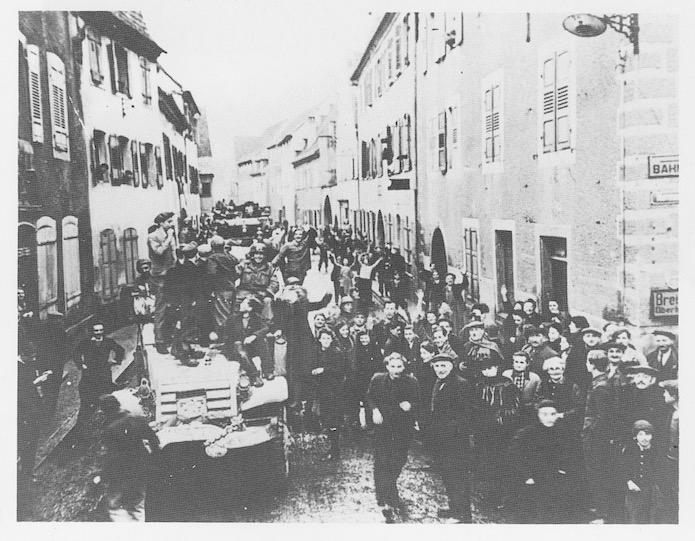 Toujours rue Poincarré, la population acclament les libérateurs. On aperçoit à droite ce qui est encore la Hermann Göring Strasse (maintenant rue du Maréchal Joffre) et qui même à la gare (bahnhof) à Neuf Brisach (Breisach) et Oberhergeim.