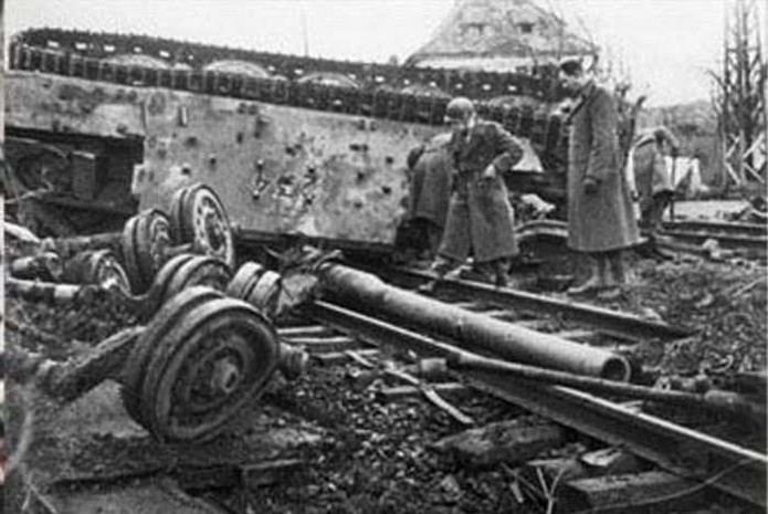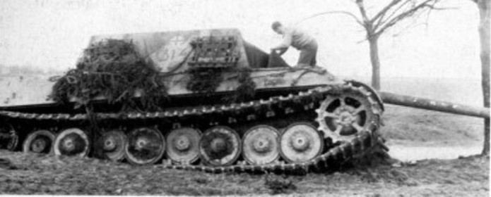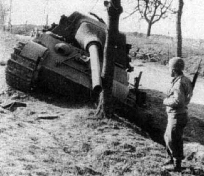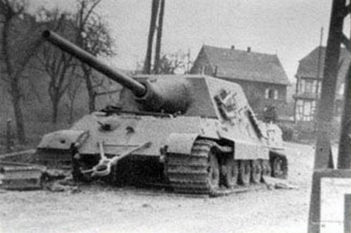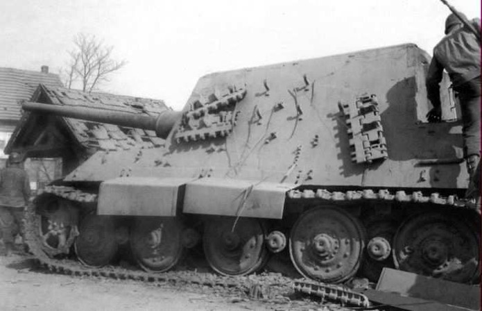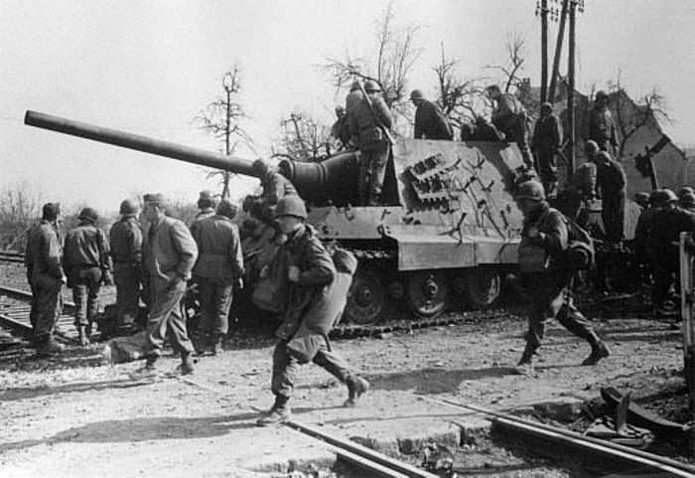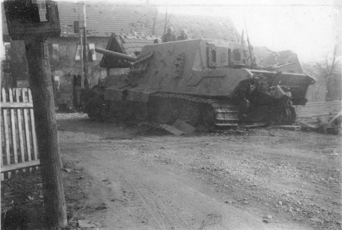 Avant Gemmershiem à Zeiskam, le Jagdtiger n° 234 subit le même sort. Le 18 mars 45, le bataillon possède 41 Jagdtigers mais seulement 34 sont en état de combattre. 7 sont perdus avant de franchir le Westwall. 18 sont expédiés vers un nouveau secteur : 5 par train et 13 par la route.16 restent pour subir des réparations à Gemmersheim. Le bataillon reçoit la mission de résister aux forcesUS dans le secteur de Bad Bergzabern en traversant Wissembourg. train de roulement Porsche furent détruits par les M36 du 776 US tank bataillon le 8 mars 45 dans la région de Morsbronn .