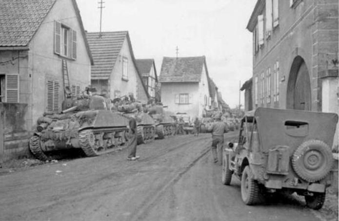 Le 2 décembre 1944,une colonne de chars Sherman M4A3 du Combat Command A, 14th Armoured Division stationne dans le village alsacien de Scherwiller. La commune a été libérée la veille. Le 1 décembre, les premiers éléments américains sont entrés dans la ville par la rue de Dambach vers 16h00. Les chars appartiennent au 48th Tank Battalion. Ce type de Sherman est de production tardive dont la tourelle armée d’un canon de 75 mmest équipée d’une trappe ovale pour le chargeur et d’une coupole à vision panoramique pour le chef de char.