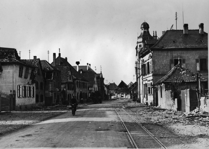 Vue de la rue principale après les bombardements du 19 juin 1940.