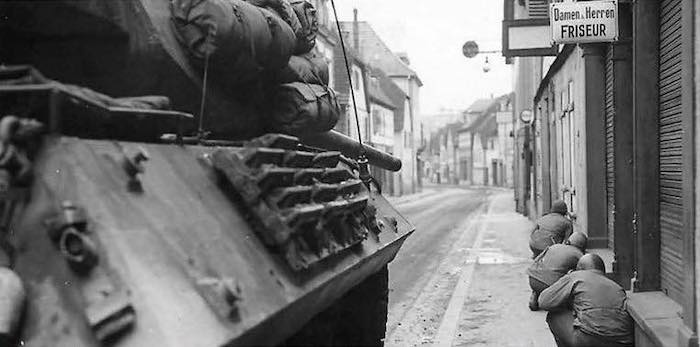 Des fantassins américains du 3rd Battalion 157th Infantry Regiment, 45th Infantry Division (the Thunderbird Division) progressent sous le couvert des façades de la rue principale. Ils sont soutenus par un chasseur de char M10 du 645th US Tank Destroyer Battalion. La ville sera finalement conquise suite à une manœuvre de débordement des défenses allemandes par le régiment US le 9 décembre 1944 .
