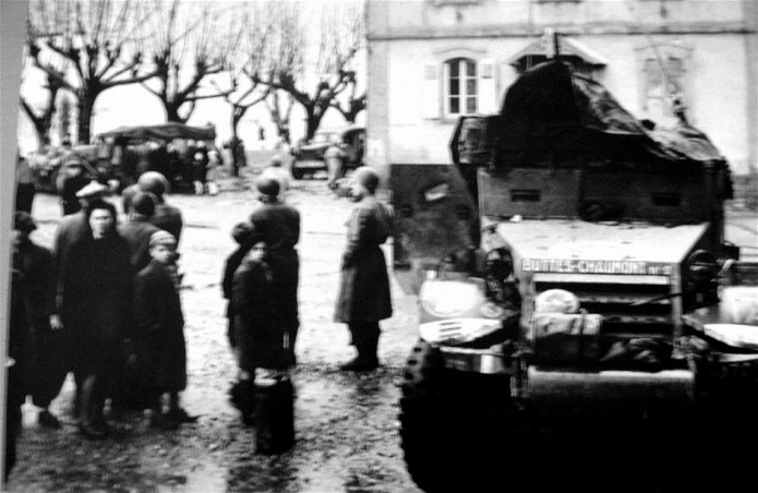 2) Vue de l’avant du « Buttes Chaumont » . En arrière plan, on distingue un autre half-track et un Dodge ambulance. Cette aire de stationnement clôturée est devenue la cour de l’école. Que sont devenus les petits alsaciens de novembre 1944 ?