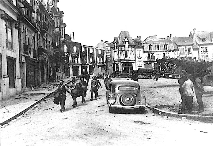Une autre colonne de prisonniers traverse la place. Tout autour de cette dernière, les maisons portent les traces des combats qui se déroulés en mai puis en juin 1940.