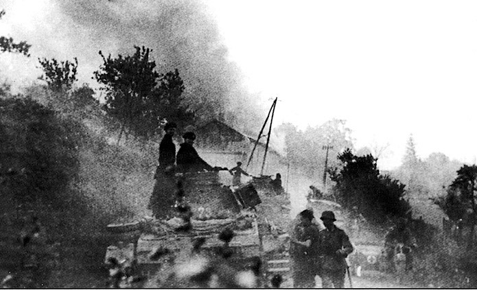 A l’entrée du village, deux PANZER III croisent un side-car arborant l’insigne de la croix rouge et une estafette.