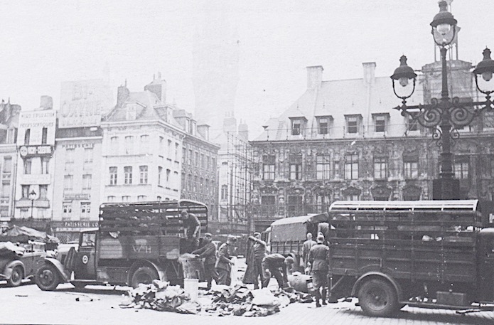 Les combats sont terminés. L’armée française a abandonné nombre d’équipements sur la Grand-place. Les Allemands se dépêchent de mettre ce lieu en ordre et tout ramasser avant la Prise d’armes scellant la capitulation des défenseurs français.