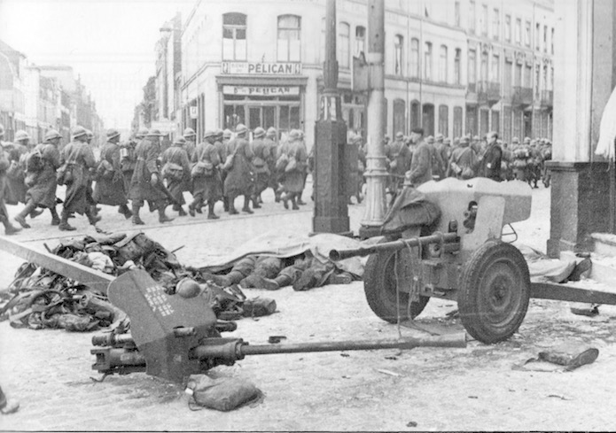 Après avoir reçu les honneurs militaires sur la grand’place de Lille, les défenseurs d’Haubourdin passent, sans armes, devant deux canons antichars de 25 mm. La dureté des combats est visible : un canon est détruit, des cadavres sont recouverts d’une bâche, la porte de l’estaminet est fracassée.