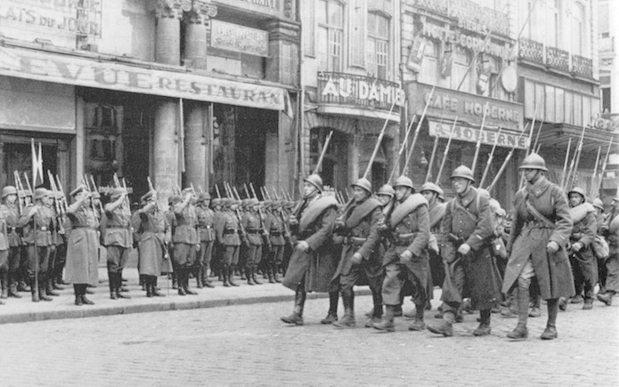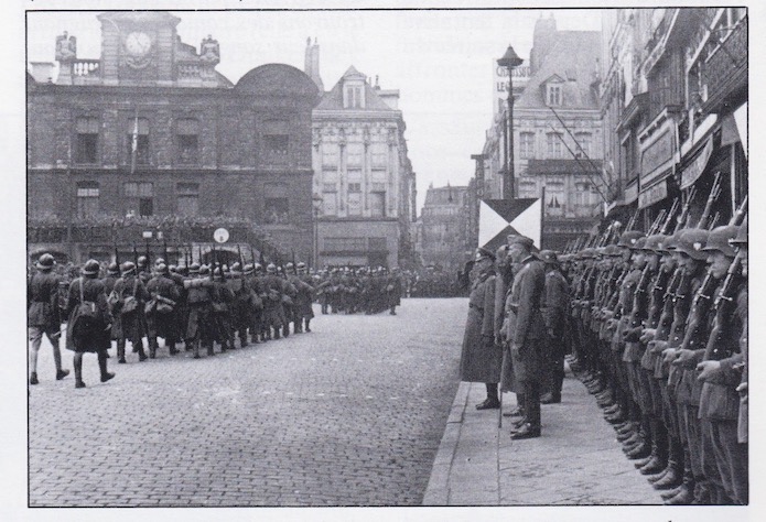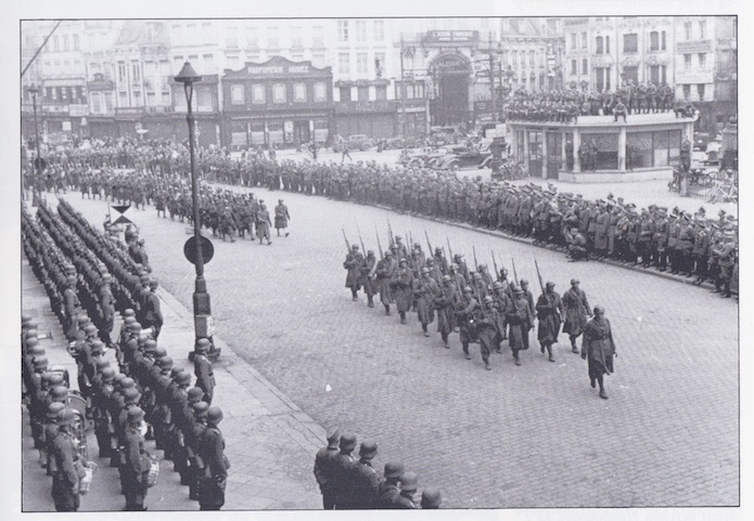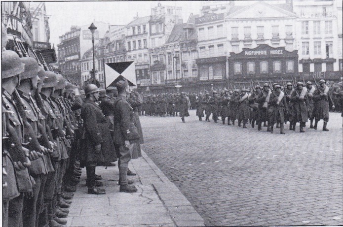 Le général allemand Wegner observe le défilé des deux divisions nord-africaines après leur passage sur la grand’place, les unités françaises s’engouffrent dans l’étroite Rue Neuve avant d’aller rejoindre la gare où elles déposeront les armes.