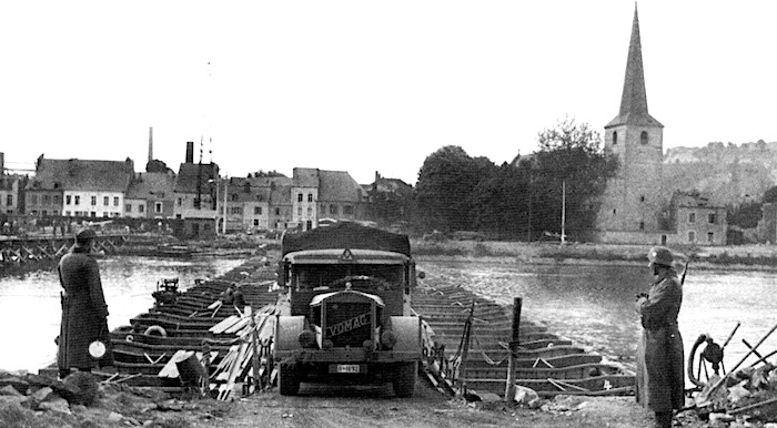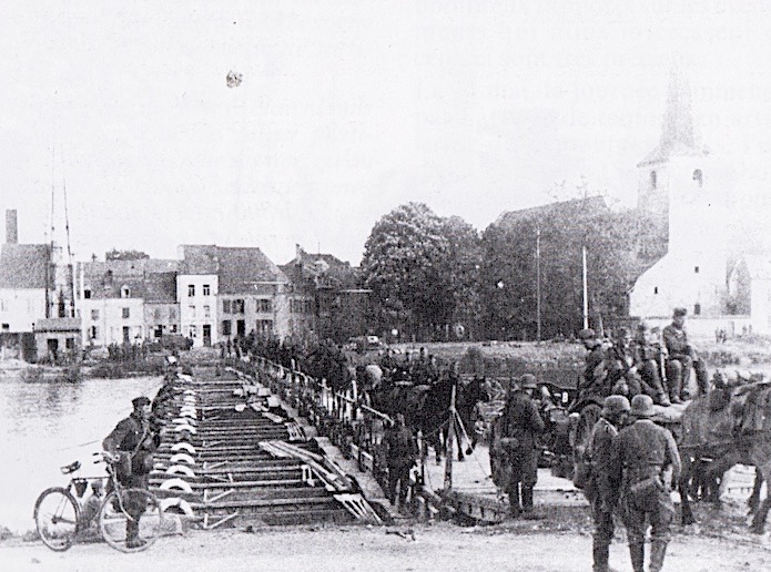 Le 15 mai 1940, un convoi d’artillerie hippomobile (obusier de 10,5 cm) traverse un pont flottant Brüken-gerät B de 16 tonnes lancé par le génie.
