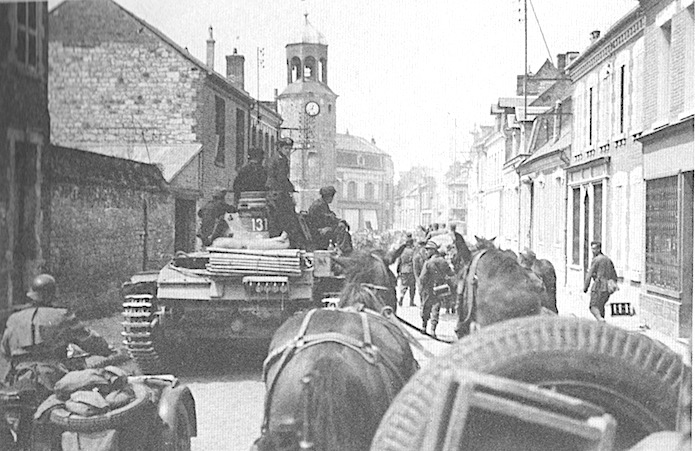 Les troupes allemandes remontent la rue des Telliers. Un Panzer III n° de tourelle 131 , suivi par un side-car, dépasse une colonne hippomobile.