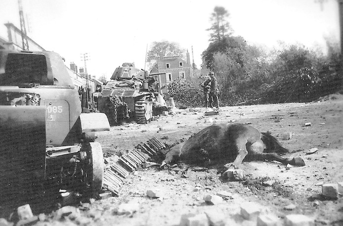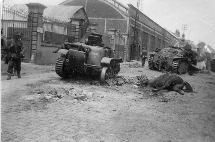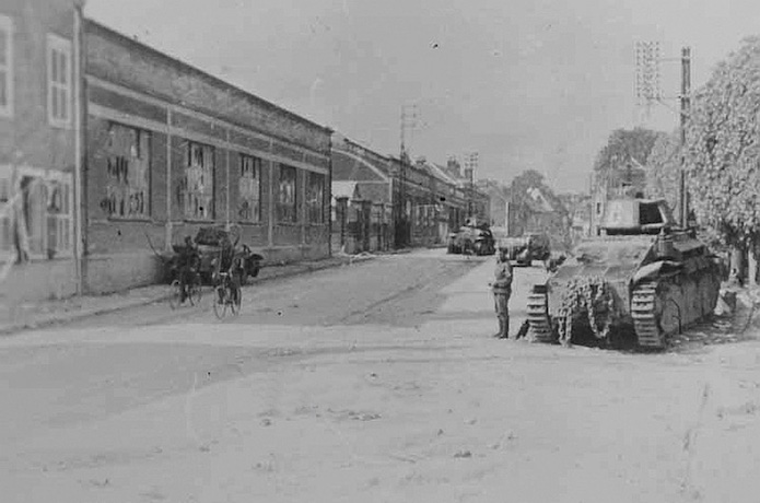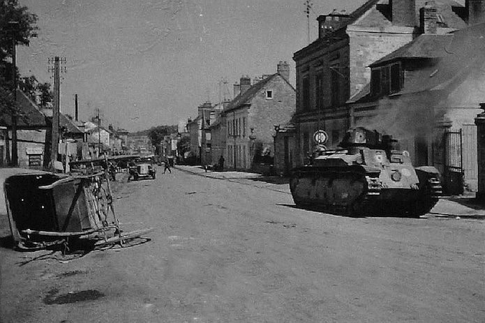 Un char R35 et le D2 L’Alma détruits devant le pont de Crécy sur Serre le 19 mai 1940 ; la combinaison des mines et des canons antichars a permis aux Allemands d’arrêter net toutes les tentatives de la 4e DCR à Crécy.