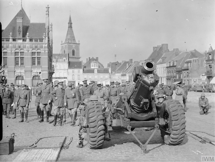 Une unité d’artillerie appartenant au BEF et équipé d’ obusiers de 6 pouces est inspectée par le général Georges et des officiers supérieurs des armées française et britannique à Orchies, le 23 avril 1940.