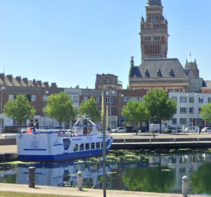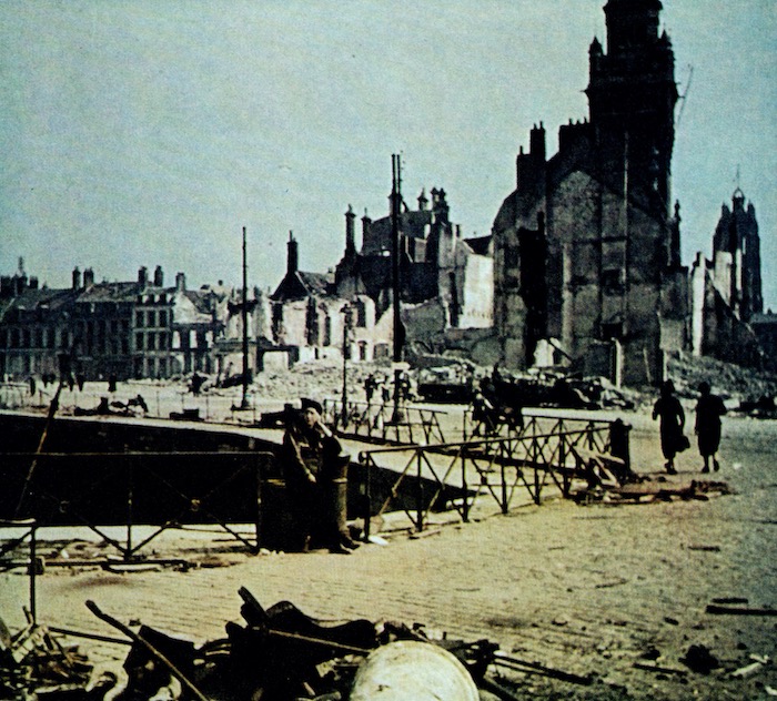 Photographie des ruines du centre-ville vue de la place du Mink. Seuls les silhouettes de la tour de l’hôtel de ville et de la tour Saint Éloi émergent du champ de ruines qu’est devenue la ville.