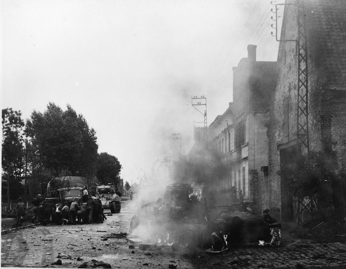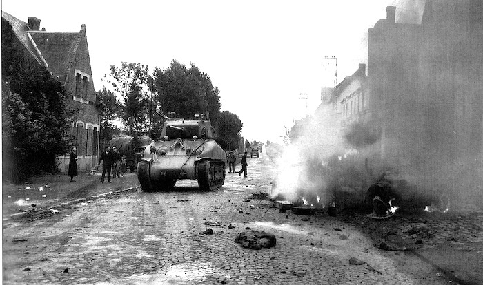Les éléments de pointe du XIX Corps continuent leur progression vers Tournai. A Aubencheul-au-Bac , village situé à 12 kilomètres au nord -ouest de Cambai, un Sherman M4A1 (76mm) de la 2nd Armoured Division traverse le village à pleine vitesse alors que brûle encore sur le bas-côté l’épave d’un véhicule allemand.