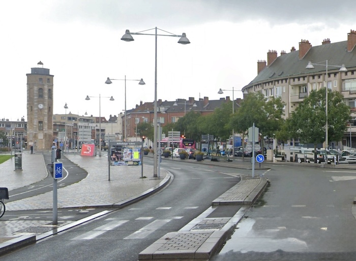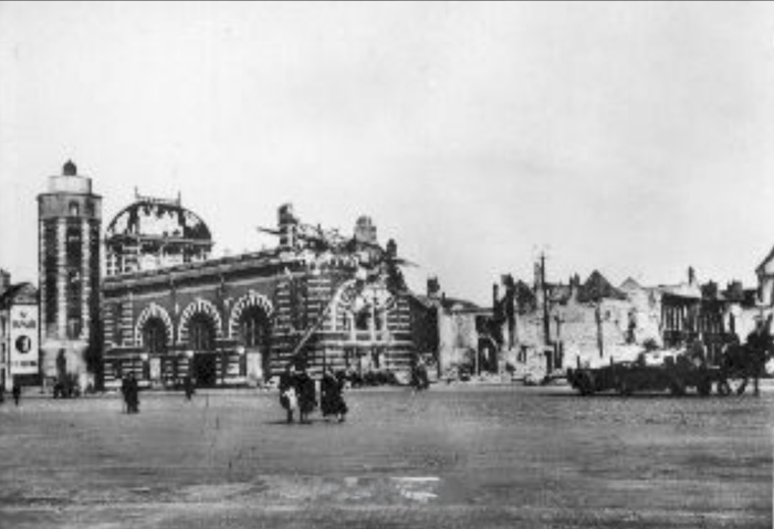 Cette photographie prise en juin 1940 montre la tour du Leughenaer dominant un centre-ville de Dunkerque dévasté. À droite, les Halles centrales apparaissent en ruines, tandis qu’un amas d’épaves de véhicules calcinés, dont une ambulance, témoigne de l’intensité des bombardements. Quelques civils médusés observent la scène, figurant la sidération de la population face aux destructions. Les habitations visibles à gauche semblent encore debout, mais disparaîtront elles aussi durant la guerre. L’image saisit l’ampleur des ravages causés par les combats et les incendies de mai-juin 1940.