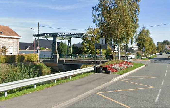 Photographie d’un pont basculant saboté afin d’empêcher les Alliés de franchir la Colme à Hoymille. Cette photographie a probablement été prise fin 1944/début1945.