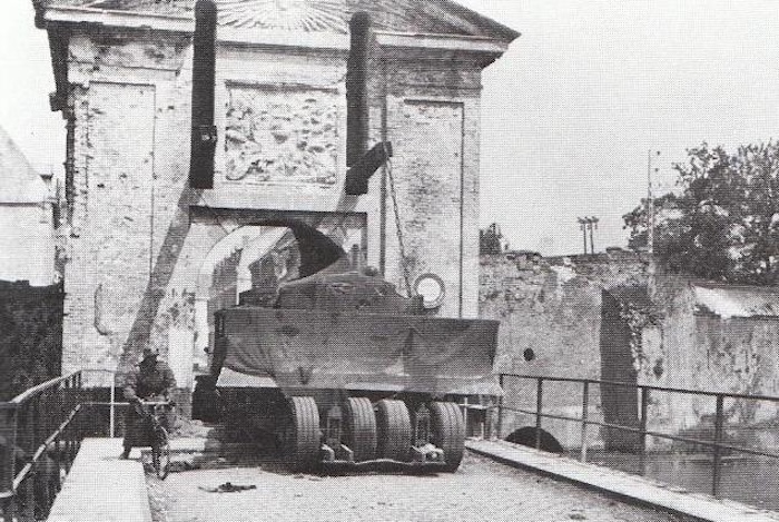 En juin 1940, au moment de l’offensive allemande, les troupes françaises encastrent dans la porte une remorque portant un engin du génie équipé d’une lame-dozer, dans le but de barrer ou de ralentir l’accès au centre-ville.