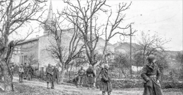 17 novembre 1944, Metzervisse tombe aux mains des fantassins de la 90 th Infantry Division. Des fantassins de cette unité traversent la village, appuyés par un TDM10 du 712th Tank Battalion et d’un Sherman M4A3E8 reconnaissable à son train de roulement HVSS. Malgré le danger occasionné par les combats, quelques civils sont restés dans la village et regardent le déploiement des forces US.