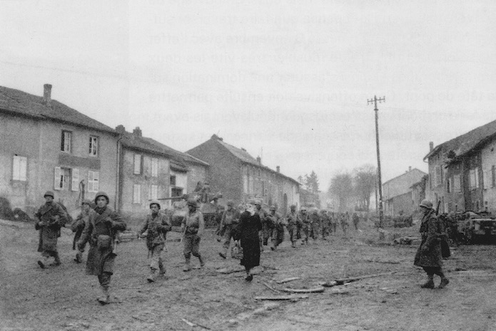 Un groupe de fantassins du 358e Régiment d'infanterie, 90e Division d'infanterie, fait une courte pause dans une rue de Metzervisse avant de reprendre leur progression vers un prochain objectif .