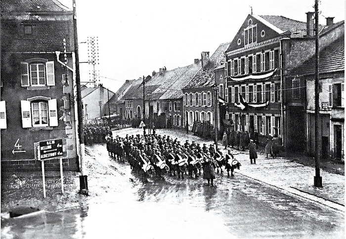 Le 35e R.I. de Belfort, musique en tête, défile dans le village vide de tout habitant.