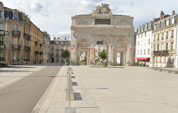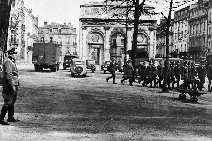 Un groupe d’officiers de la Wehrmacht traverse la place en formation, sous le regard d'un officier d'encadrement au premier plan. Les uniformes soignés, sans armement visible, suggèrent un déplacement administratif dans une ville désormais sous contrôle. À l’arrière-plan, plusieurs véhicules allemands peints en gris panzer confirment une datation précoce de l’occupation. L’absence de civils et les arbres dénudés situent la scène durant la saison froide, probablement à l’automne 1940 ou à l’hiver 1940-1941, peu après l’entrée des troupes allemandes à Nancy.