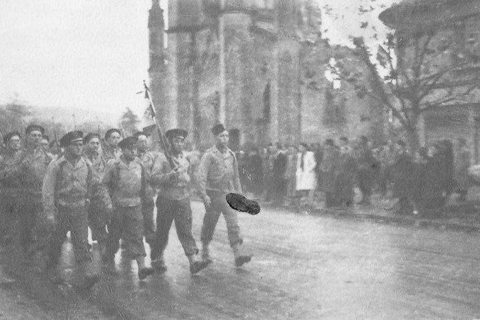 13 Novembre 1944 Le RBFM défile dans Baccarat. Il passe devant les ruines de l’église.