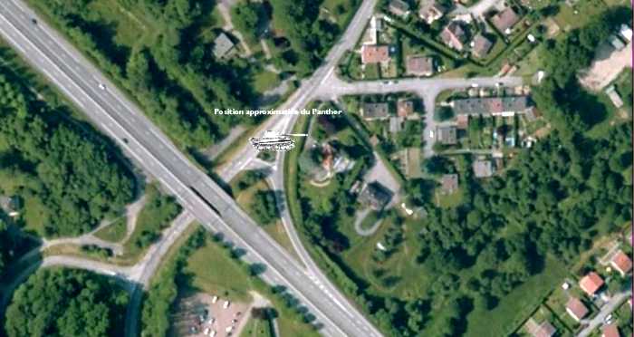 Thaon les Vosges se situe à environ 10 km au nord d’Epinal. En septembre 1944, les Allemands abandonnèrent un char Panther Ausf G à l’entrée de la ville. Ce char appartient probablement au I./Pz. Rgt. 29 de la PanzerBrigade 112. A-t-il été abandonné lors du repli de cette unité après son engagement désastreux les 12 et 13 septembre à Dompaire face à la 2ème Division Blindée française ? Panne technique ou manque de carburant ? L’engin ne semble pas avoir été détruit au combat. L’aménagement d’une rocade de sortie de la voie express Epinal Nancy a modifié l’aspect du lieu (voir photo aérienne). Seule la toiture de la maison protégée par une épaisse haie permet de localiser l’endroit.