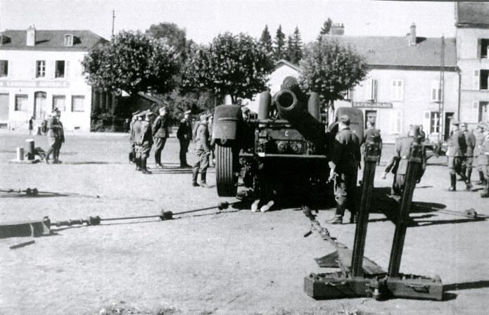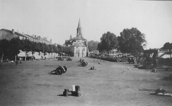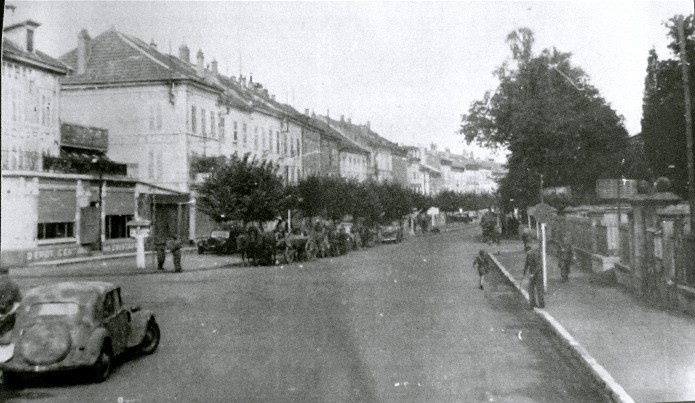 La suprématie aérienne alliée est présente. Les Allemands ont camouflés leurs véhicules sous les arbres bordant la place. 2 fourgons hippomobiles remontent la rue. Une traction ayant reçu un camouflage trois tons est visible au premier plan. Une autre de couleur noire est stationné sur le trottoir.