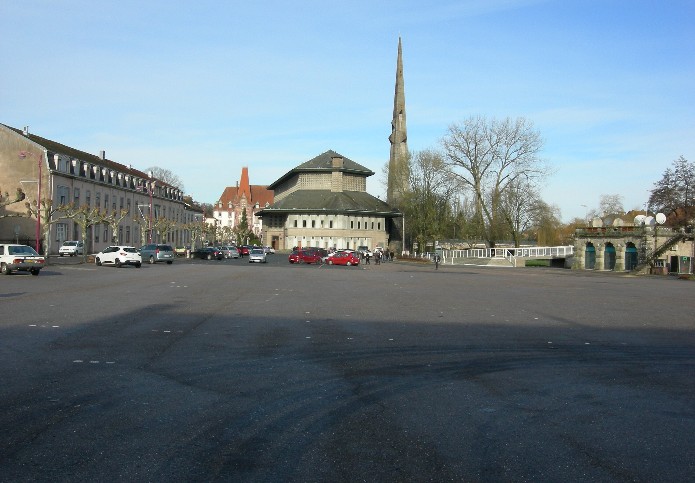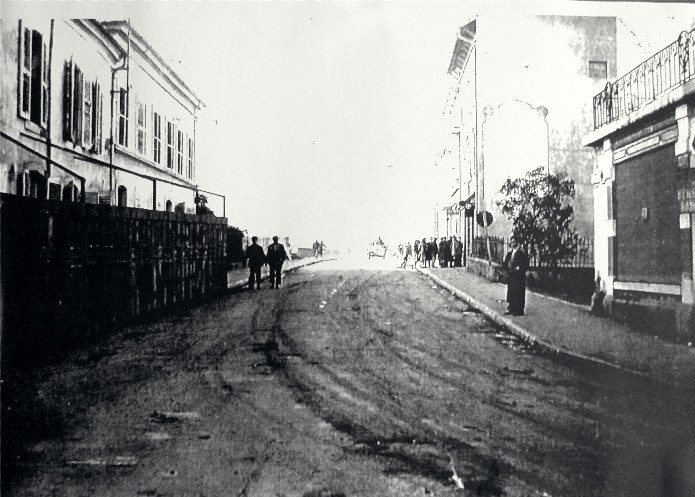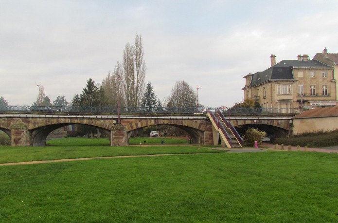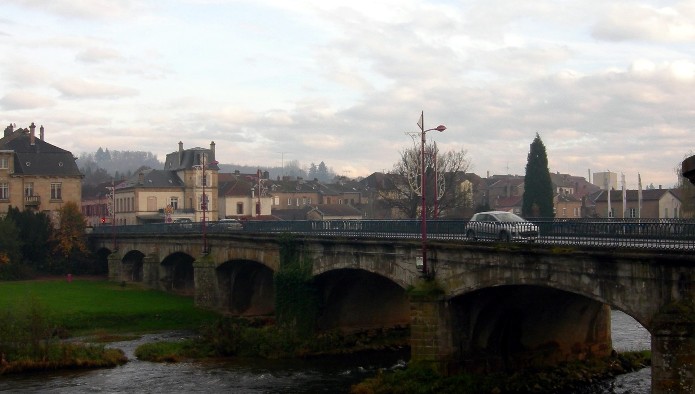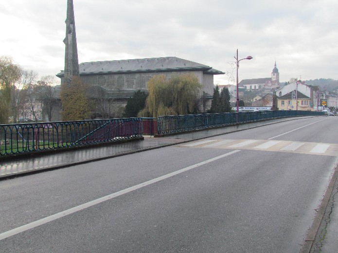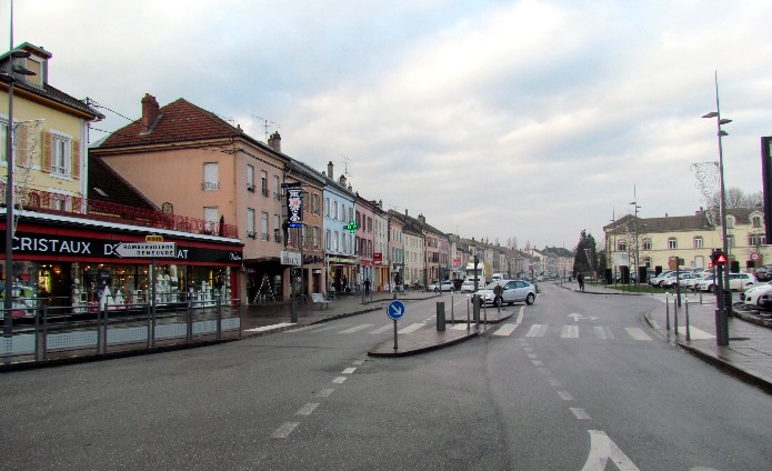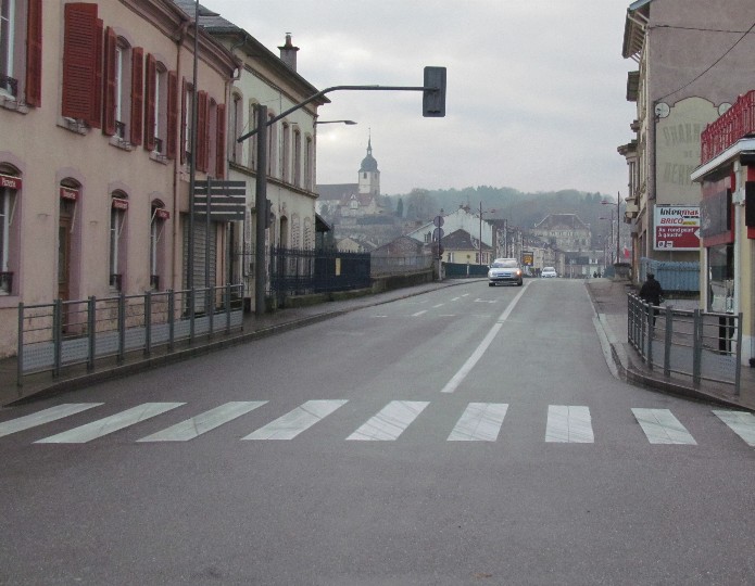 Vue du carrefour en allant vers le pont : à gauche de la chaussée, la façade latérale de l’hôtel du pont, siège de la sinistre gestapo