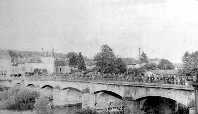 Une importante colonne de prisonniers français traverse le pont en direction des camps de transit.