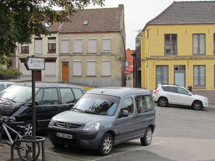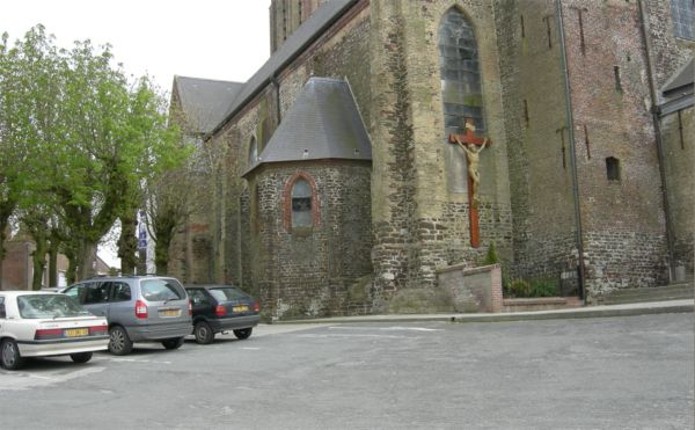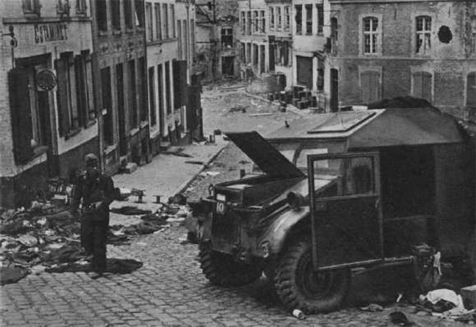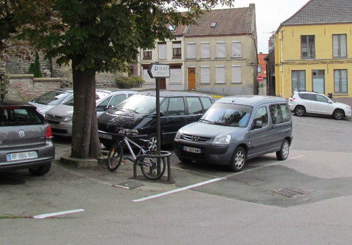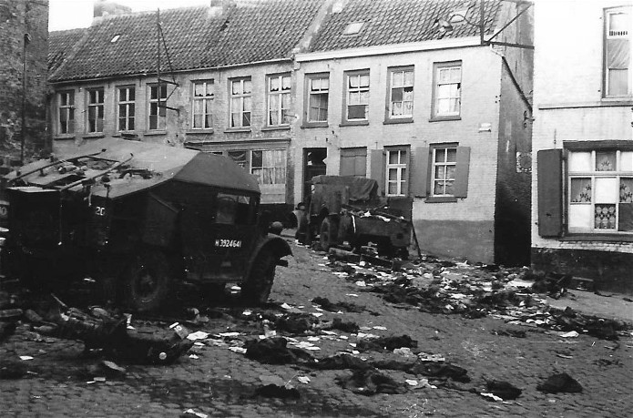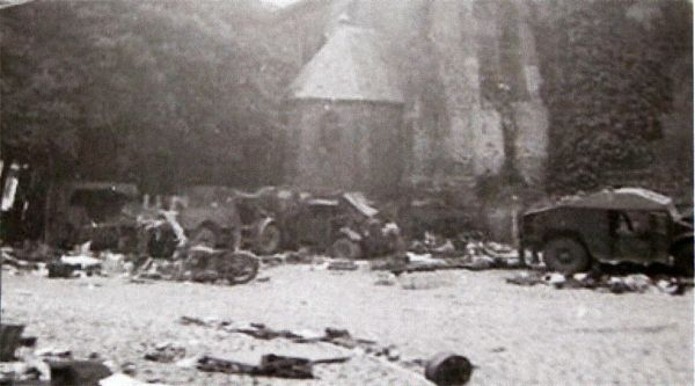 Ces documents presque identiques nous montrent le parvis de l’église encombrée de véhicules britanniques abandonnés. Certains sont camouflés sous les marronniers.