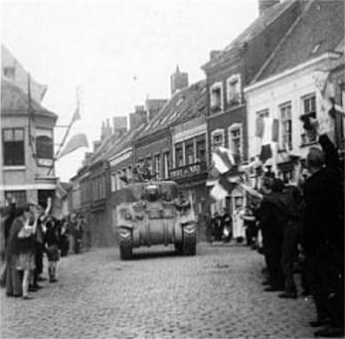 Arrivée d'un Sherman de la 1ère Division Blindée polonaise sur la Grand-Place