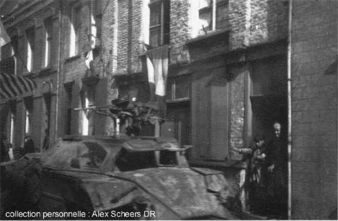 Passage des libérateurs rue Foch. On y voit des Sherman et un Humber Scout Car.